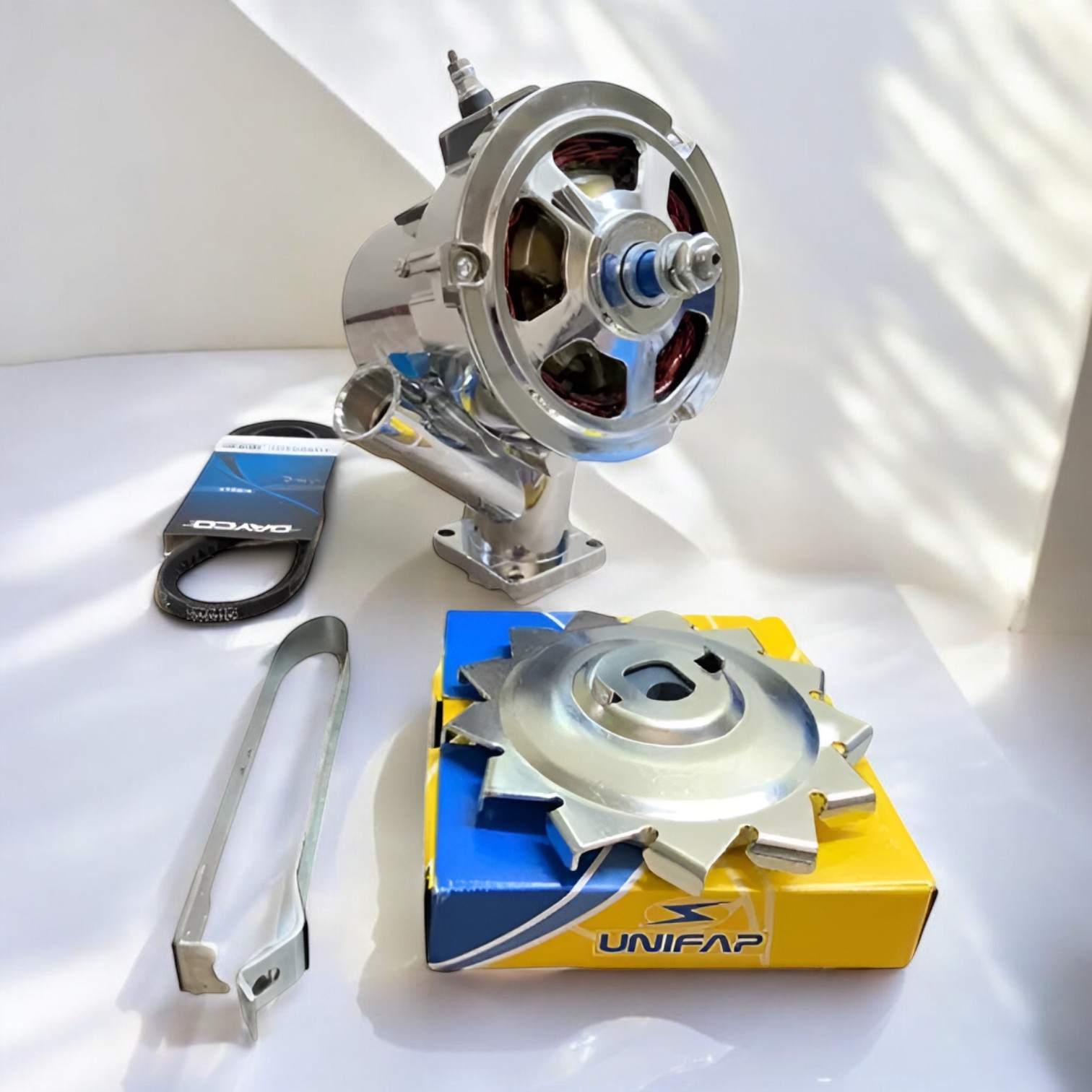 Alternador MQ 0565: Carcaça em alumínio cromado resistente à corrosão, rolamentos selados e enrolamento de cobre termorresistente.
